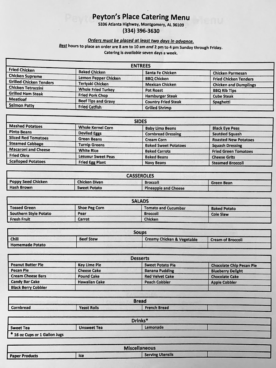 Welcome to Peyton's Place LLC, a gem tucked away at 5336 Atlanta Hwy, Montgomery, AL. This vibrant eatery offers a menu that celebrates home-cooked goodness at prices that won't break the bank. Each platter is a treat, featuring highlights like the Fried Catfish Platter and Grilled Lemon Pepper Shrimp Platter, both lovingly served with your choice of three sides for just $11.95.